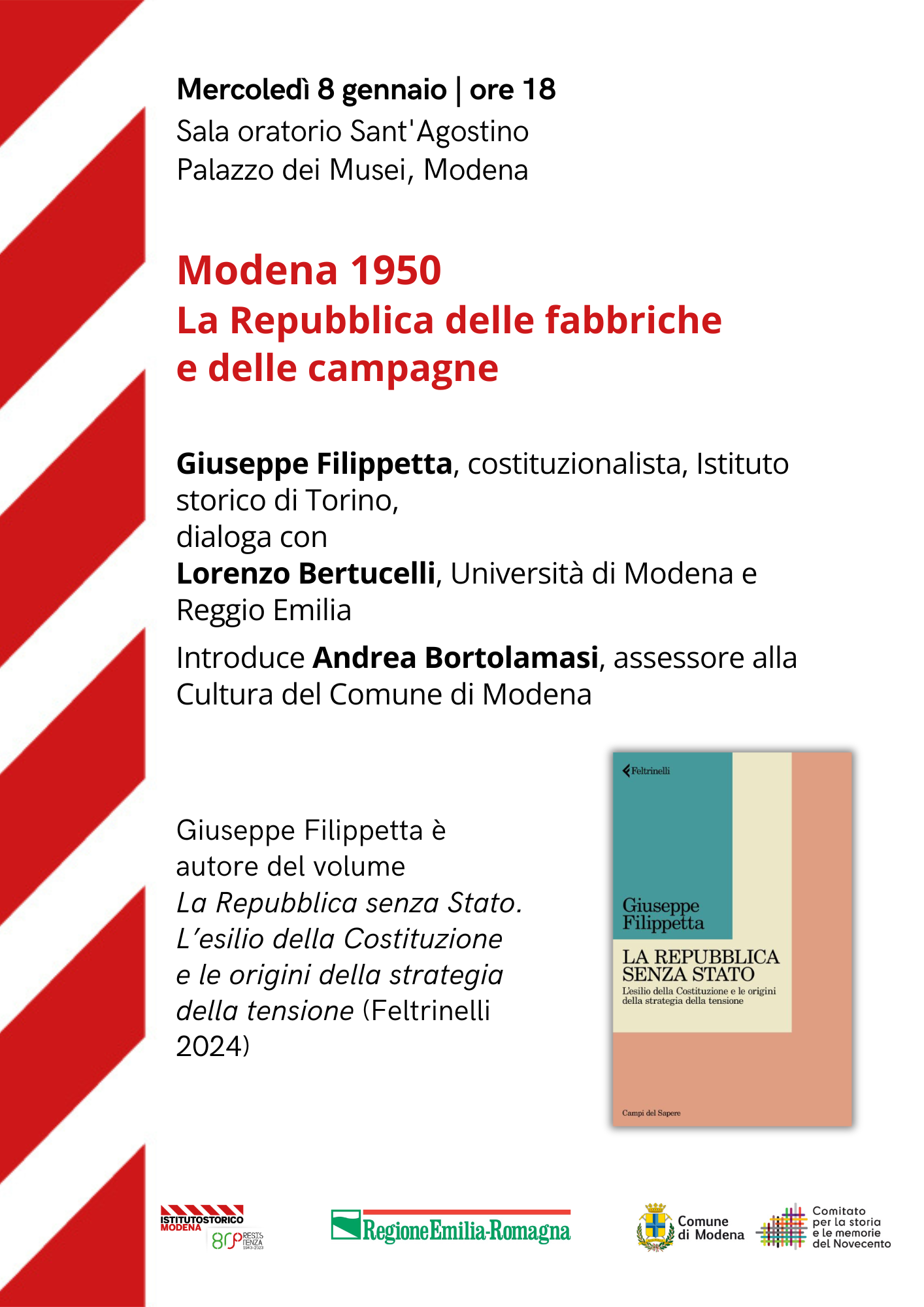 Mercoledì 8 gennaio alle 18, presso la Sala oratorio di Palazzo dei Musei si svolgerà l'incontro Modena 1950. La Repubblica delle fabbriche e delle campagne. Giuseppe Filippetta, costituzionalista e collaboratore dell'Istituto storico di Torino, dialogherà con Lorenzo Bertucelli, Università di Modena e Reggio Emilia, a partire dal suo libro La Repubblica senza Stato. L’esilio della Costituzione e le origini della strategia della tensione, Feltrinelli 2024.