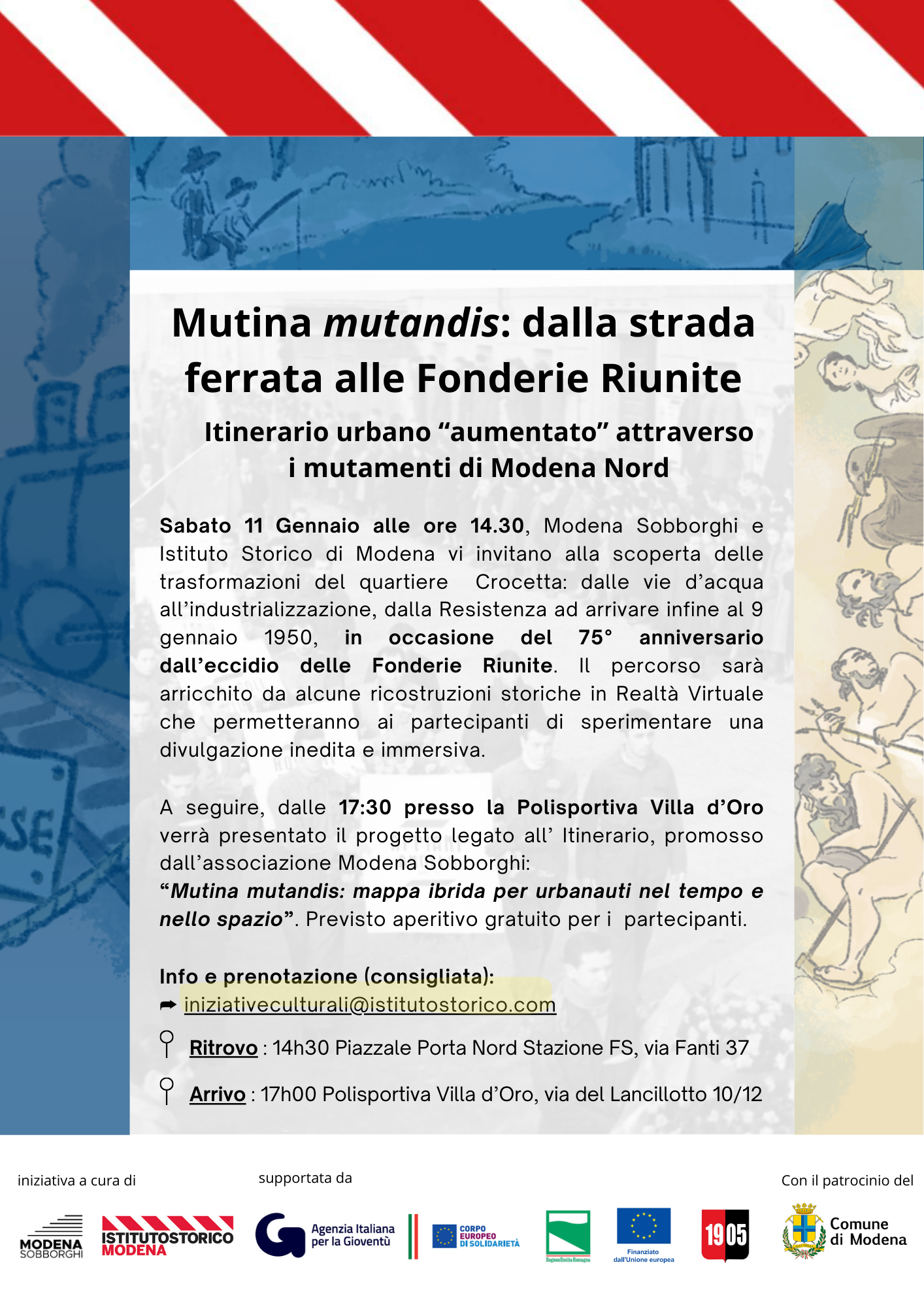 Per sabato 11 gennaio è invece in programma il trekking urbano Mutina Mutandis: dalla strada ferrata alle Fonderie Riunite per la rassegna Camminare la storia, organizzato da Istituto storico e Modena Sobborghi.