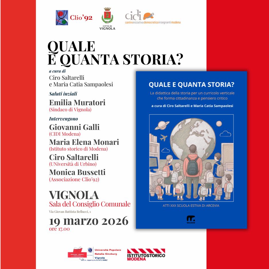 L’iniziativa, organizzata dal Centro iniziativa democratica Insegnanti di Modena (CIDI), con il patrocinio del Comune di Vignola e in collaborazione con l’Istituto storico di Modena, l’Associazione Clio ’92 e l’Università popolare della terza età Natalia Ginzburg di Vignola, è un appuntamento aperto a docenti, studenti, educatori e a chiunque sia interessato a scoprire “quale” e “quanta” storia serva oggi per comprendere il mondo e partecipare in modo attivo e critico alla vita democratica.